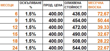 Примерен план за разсрочено изплащане на услуга в размер на 400 лв.: